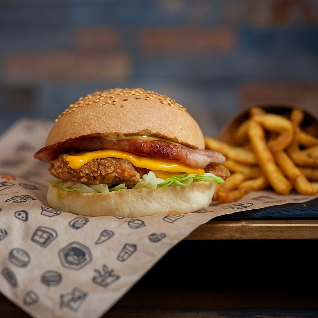Bun artisanal frais, Escalope de poulet panée Maison, Salade iceberg, Double cheddar, Bacon, Sauce miel/moutarde Maison.