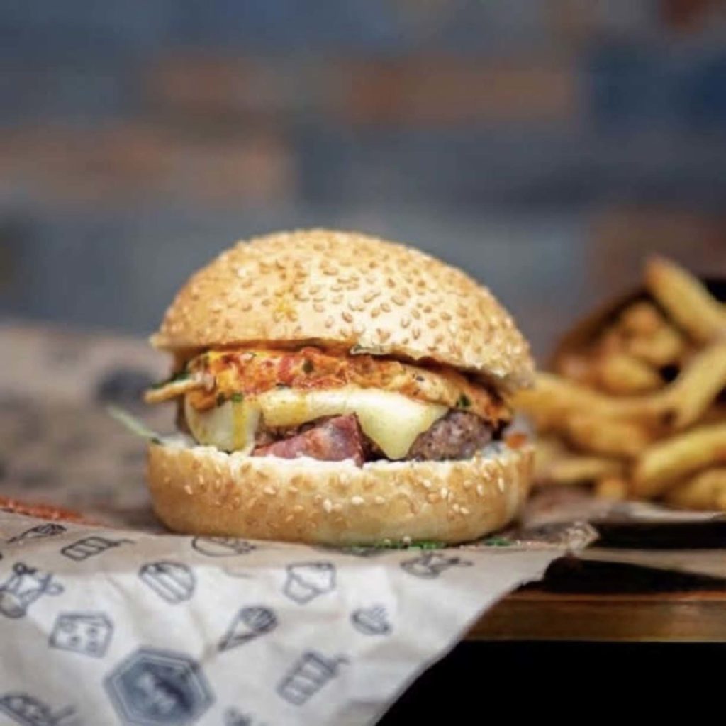 Bun artisanal frais, Bœuf charolais, Emmental, œuf, assaisonnement du chef, bacon, sauce Aïoli Maison