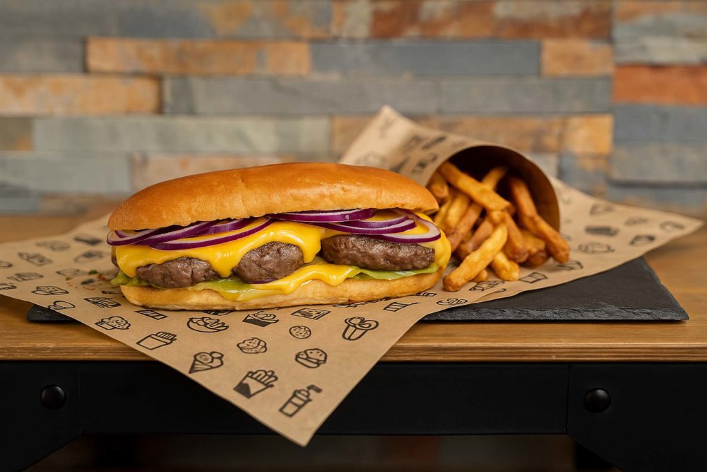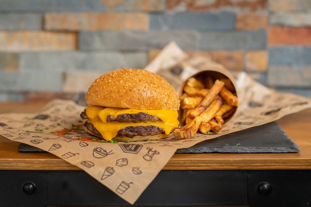 Bun artisanal frais, Double steaks de boeuf charolais, Double Cheddar, Cornichons maison, Salade Iceberg, Sauce Signature maison