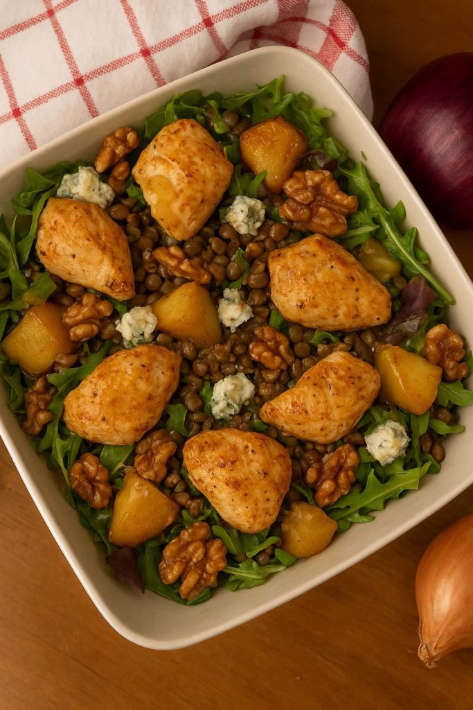 Mélange de salade, Lentilles, Éclats de bleu d’Auvergne AOP, Pommes caramélisées Maison, Noix concassées, Filet de poulet mariné, Croutons à l’ail, Vinaigrette miel moutarde Maison