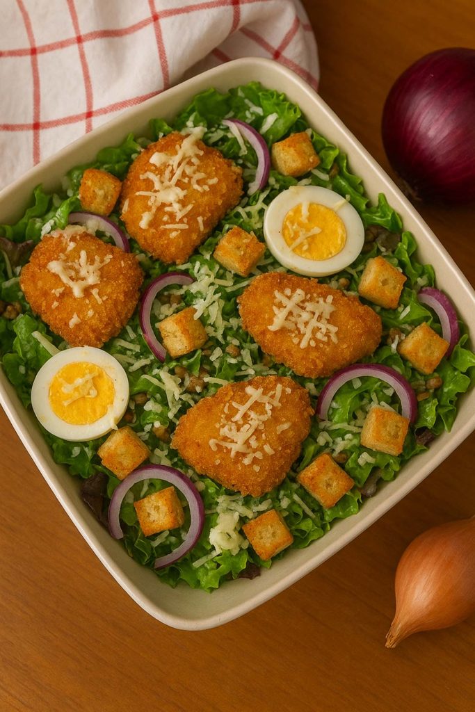 Mélanges de salades, Éclats de galettes de pommes de terres maison panés, Oeuf dur, Oignons rouges, Parmesan, Croûtons à l'ail, Sauce César